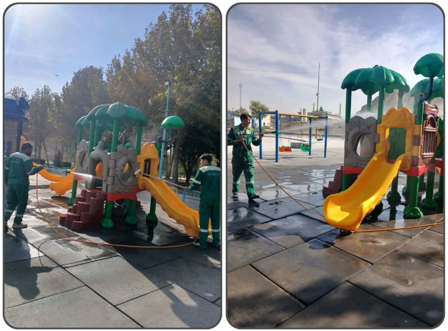 شستشو و ضد عفونی نمودن وسایل بازی و ورزشی پارک ساحلی جهت استفاده کودکان و سایر شهروندان توسط معاونت فضای سبز شهرداری