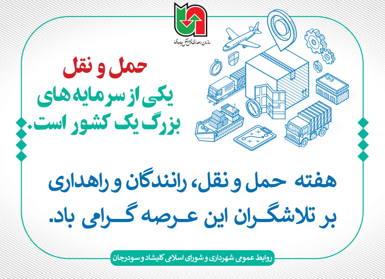 اینجانبان با گرامیداشت هفته حمل و نقل، رانندگان و راهداری، از تمامی رانندگان عزیز و راهداران پرتلاش، به ویژه فعالان خدوم حوزه حملونقل شهری و برونشهری در شهر کلیشاد و سودرجان صمیمانه قدردانی نموده و از خداوند متعال برای ای عزیزان، موفقیت، سلامتی و سربلندی مسئلت مینمائیم.