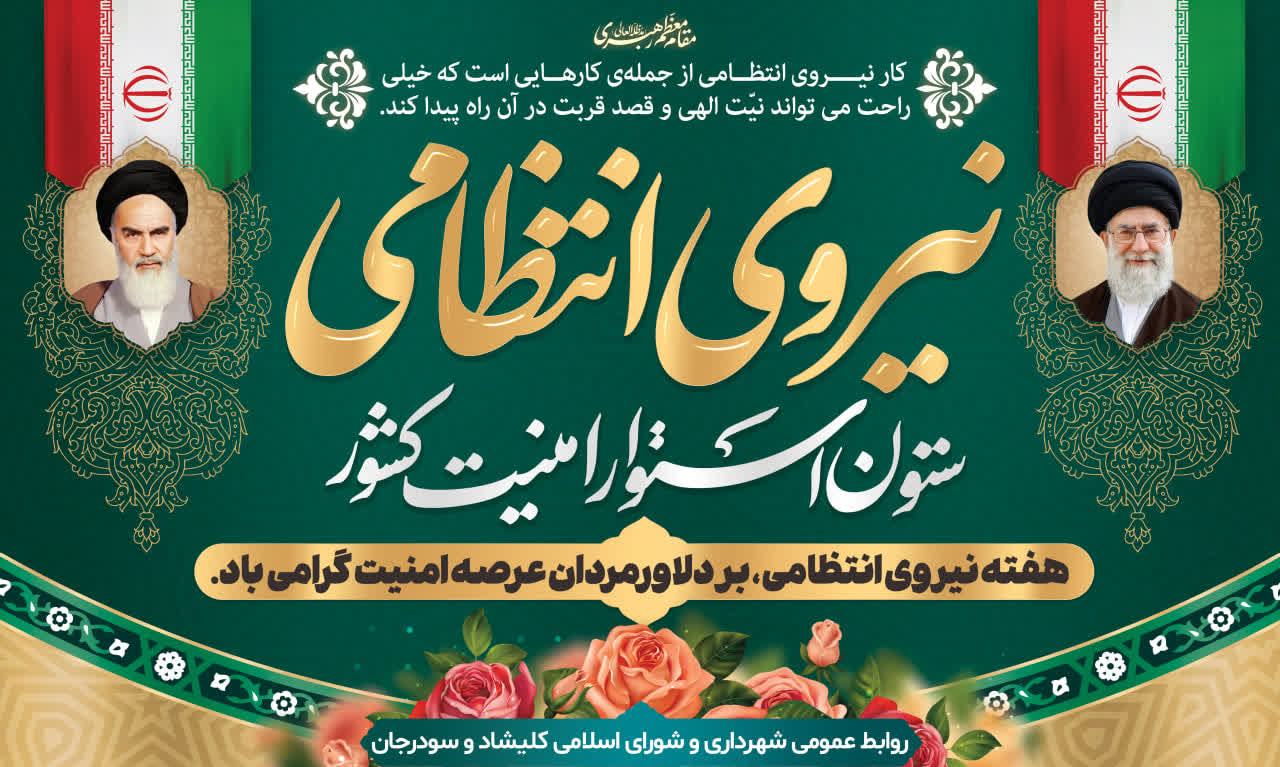 بدینوسیله فرارسیدن “هفته نیروی انتظامی” را به تمامی فرماندهان، افسران، درجهداران و سربازان غیور و سلحشور نیروی انتظامی جمهوری اسلامی ایران، به ویژه پرسنل محترم کلانتری ۱۳ کلیشاد و سودرجان که با تعهد مثالزدنی، حضور مقتدرانه و تعامل سازنده با شهروندان، در جهت ایجاد فضایی امن و آرام برای زندگی، تحصیل و کسب و کار مردم شریف کلیشاد و سودرجان تلاش میکنند، صمیمانه تبریک و تهنیت عرض نموده، از درگاه خداوند متعال توفیق روزافزون، سلامتی و سربلندی تمامی این عزیزان را در مسیر خطیر حفظ امنیت و خدمت به نظام مقدس جمهوری اسلامی ایران مسئلت مینمائیم.