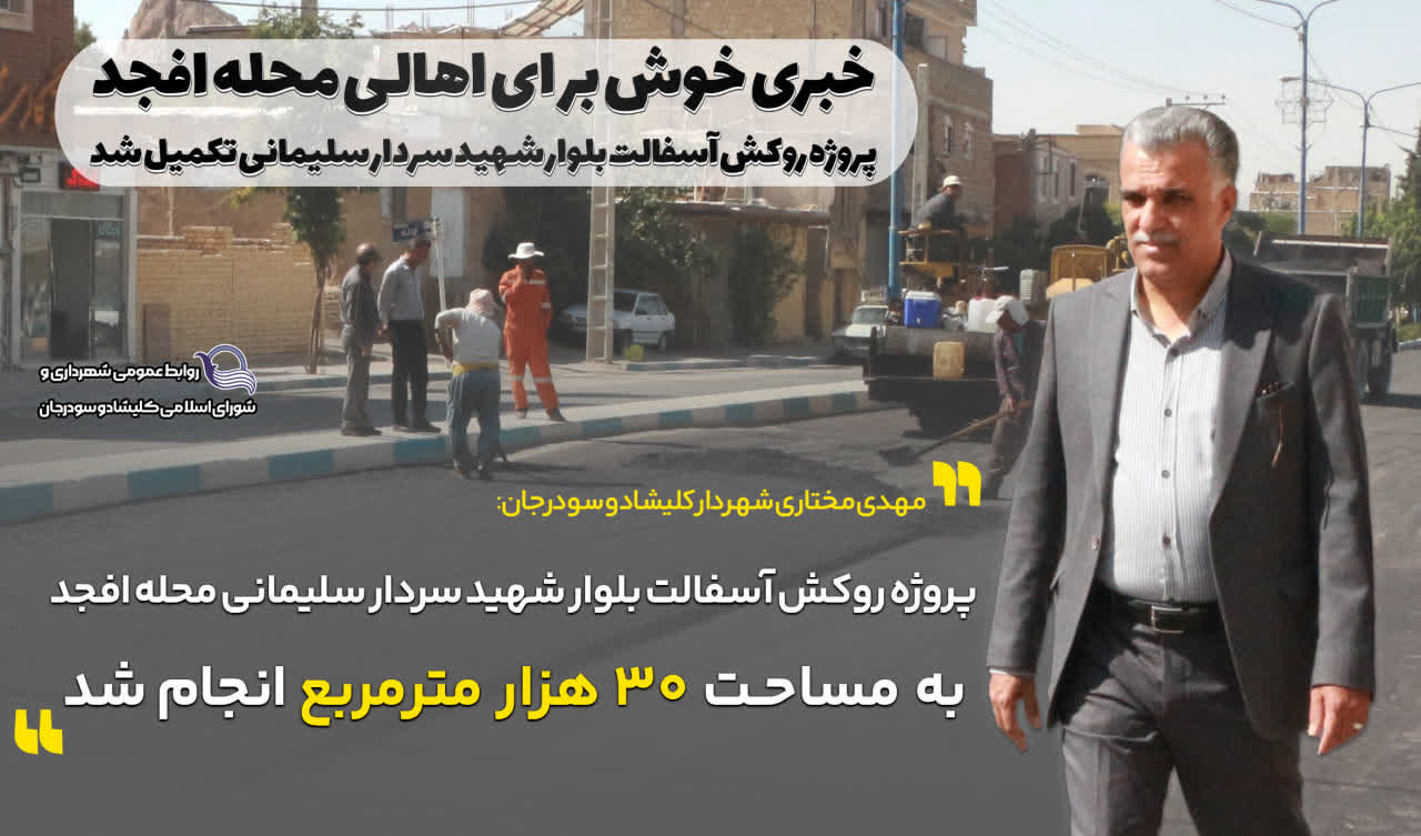 به گزارش روابط عمومی شهرداری و شورای اسلامی، مهندس مختاری شهردار کلیشاد و سودرجان در پی اتمام پروژه روکش آسفالت بلوار شهید سردار سلیمانی بیان نمود: عملیات روکش آسفالت بلوار شهید سردار سلیمانی، واقع در محله  افجد، در دو لاین رفت و برگشت به صورت کامل انجام و به پایان رسید.