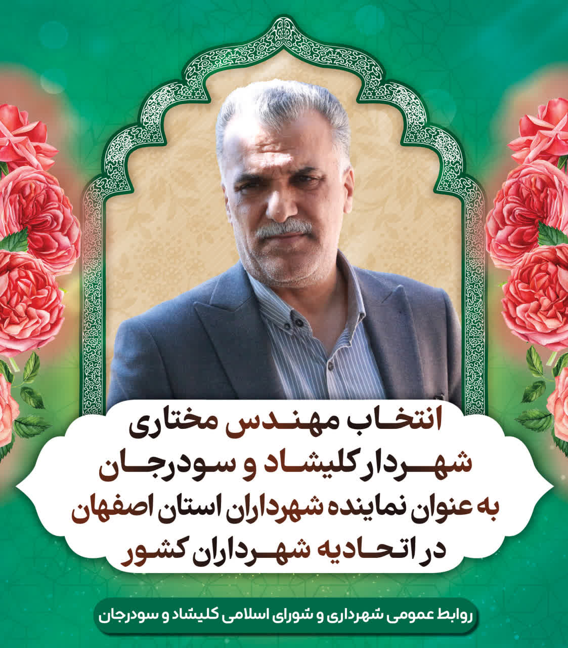 به گزارش روابط عمومی شهرداری و شورای اسلامی کلیشاد و سودرجان، انتخابات ماده ۸۵ قانون برنامه پیشرفت، با حضور ۱۰۷ شهردار از سراسر استان اصفهان و با رقابت میان ۱۹ نامزد برگزار شد و مهندس مختاری شهردار کلیشاد و سودرجان منتخب و نماینده شهرداران استان در اتحادیه شهرداران کشور گردید.