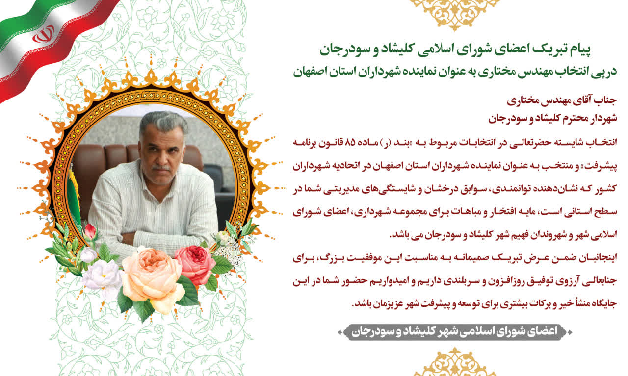 انتخاب شایسته حضرتعالی در انتخابات مربوط به «بند (ر) ماده ۸۵ قانون برنامه پیشرفت» و منتخب به عنوان نماینده شهرداران استان اصفهان در اتحادیه شهرداران کشور که نشاندهنده توانمندی، سوابق درخشان و شایستگیهای مدیریتی شما در سطح استانی است، مایه افتخار و مباهات برای مجموعه شهرداری، اعضای شورای اسلامی شهر و شهروندان فهیم شهر کلیشاد و سودرجان می باشد.