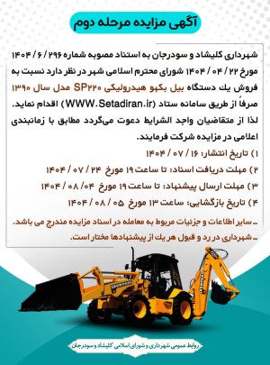 آگهی مزایده مرحله دوم یک دستگاه بیل بکهو هیدرولیکی SP220 مدل 1390