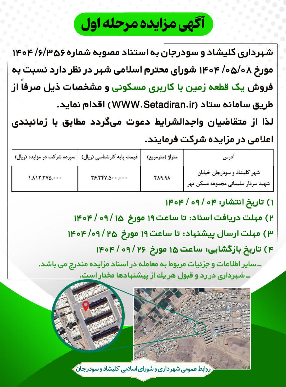 آگهی مزایده مرحله اول فروش زمین مسکونی
